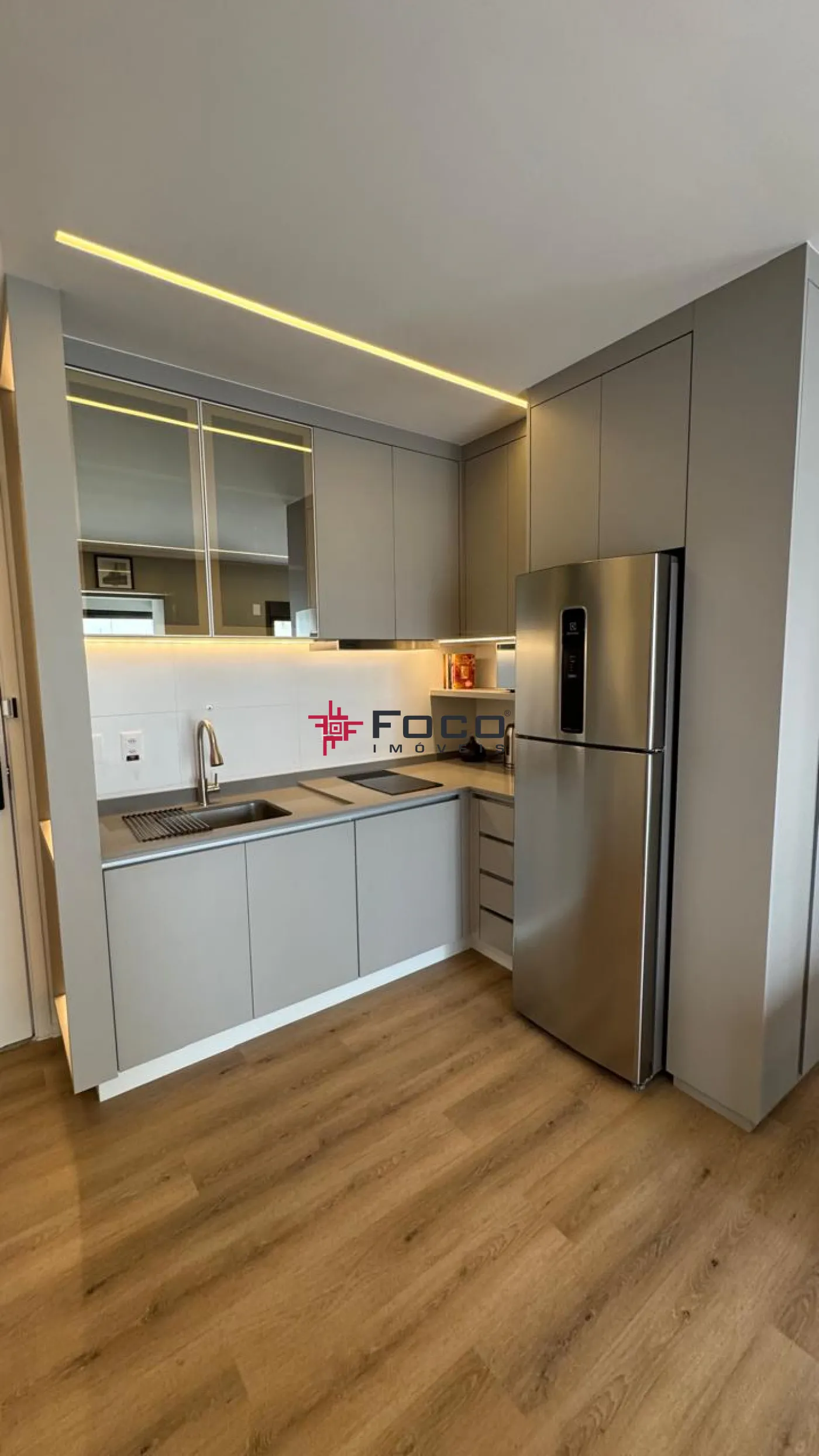 - Cozinha planejada com fogão de indução, geladeira e micro-ondas