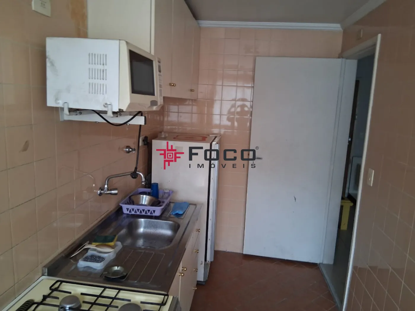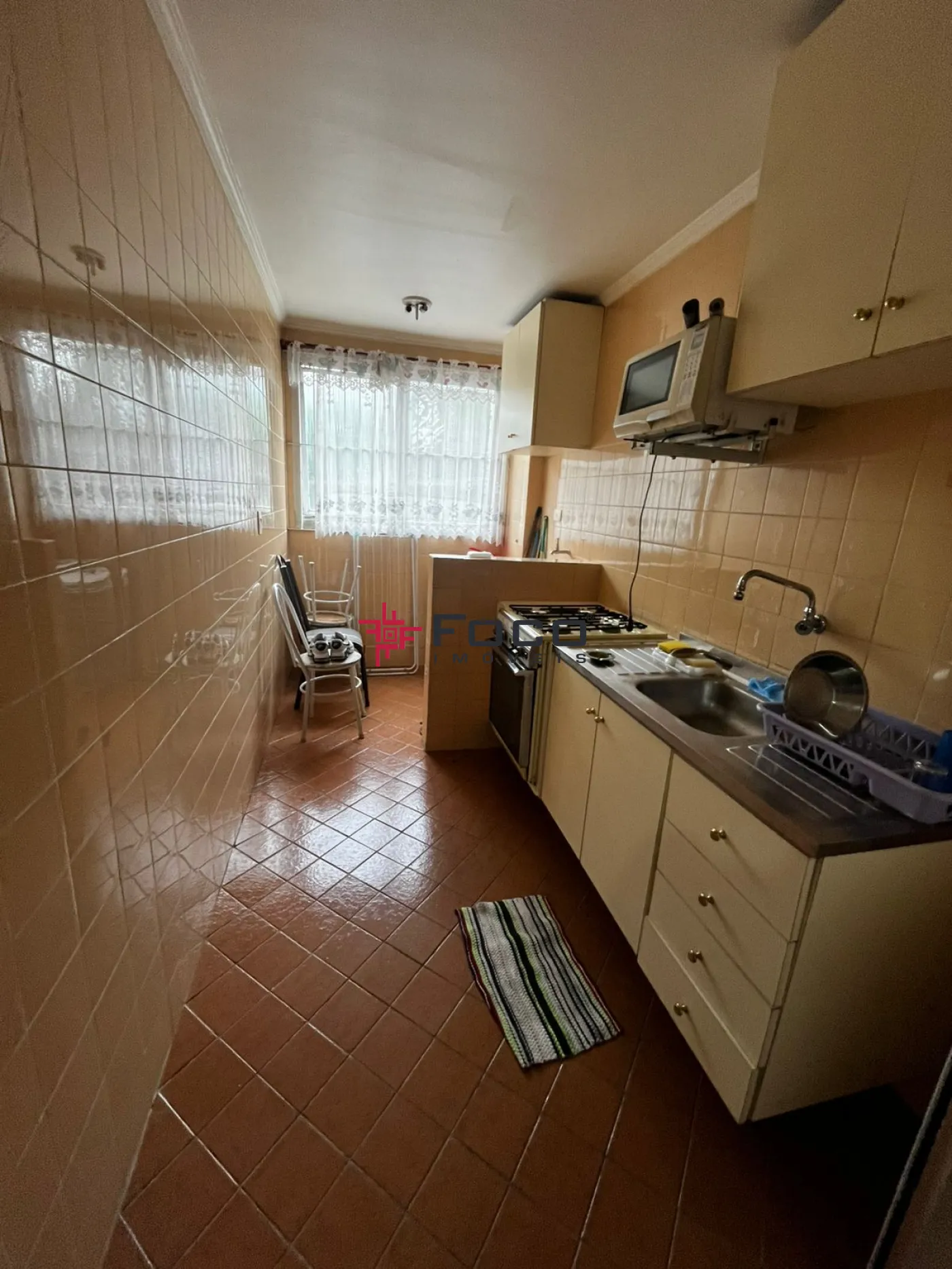 - Cozinha com armários, fogão, geladeira, microondas