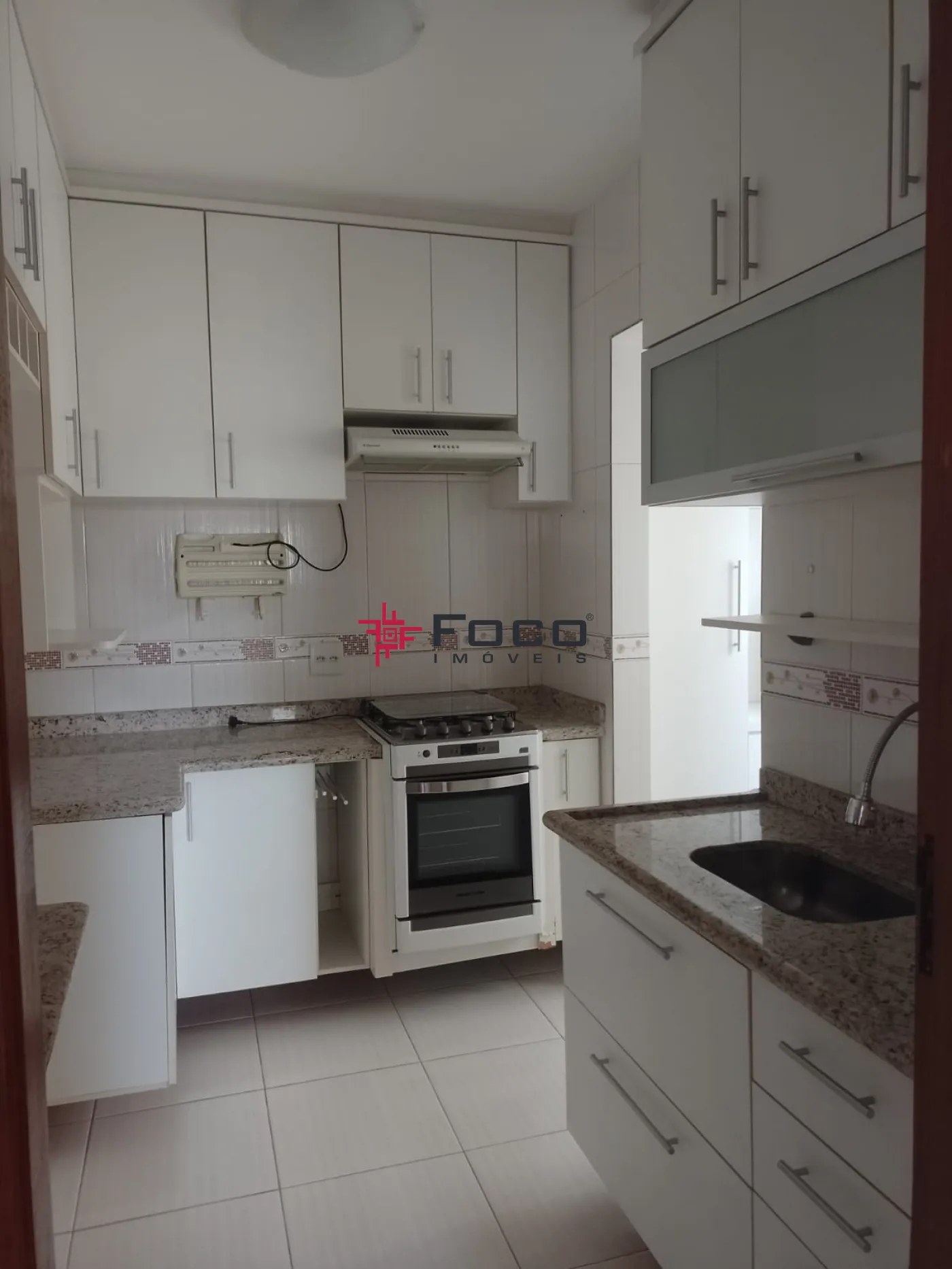 - Cozinha repleta de armários, geladeira, fogão embutido e depurador de ar