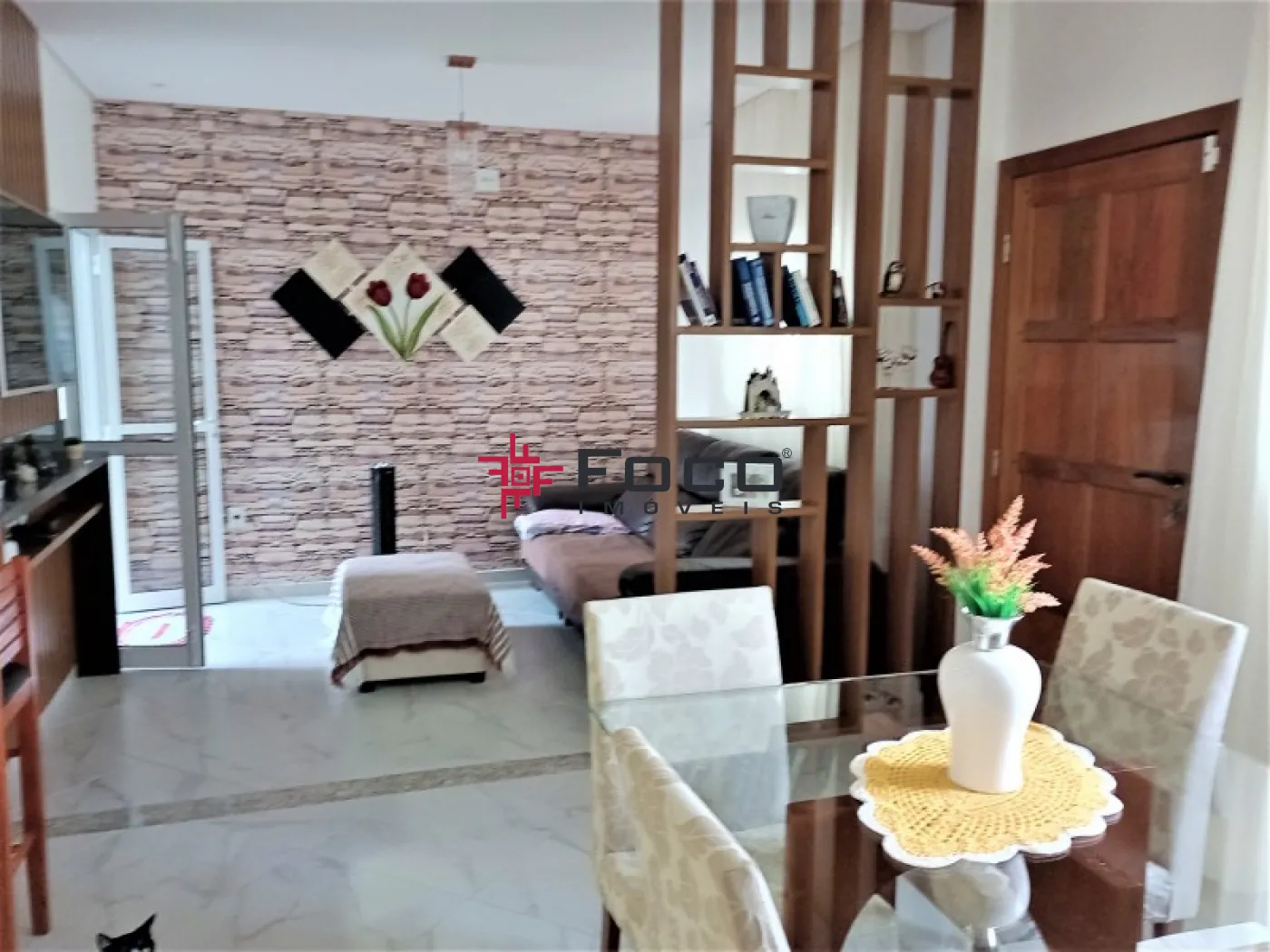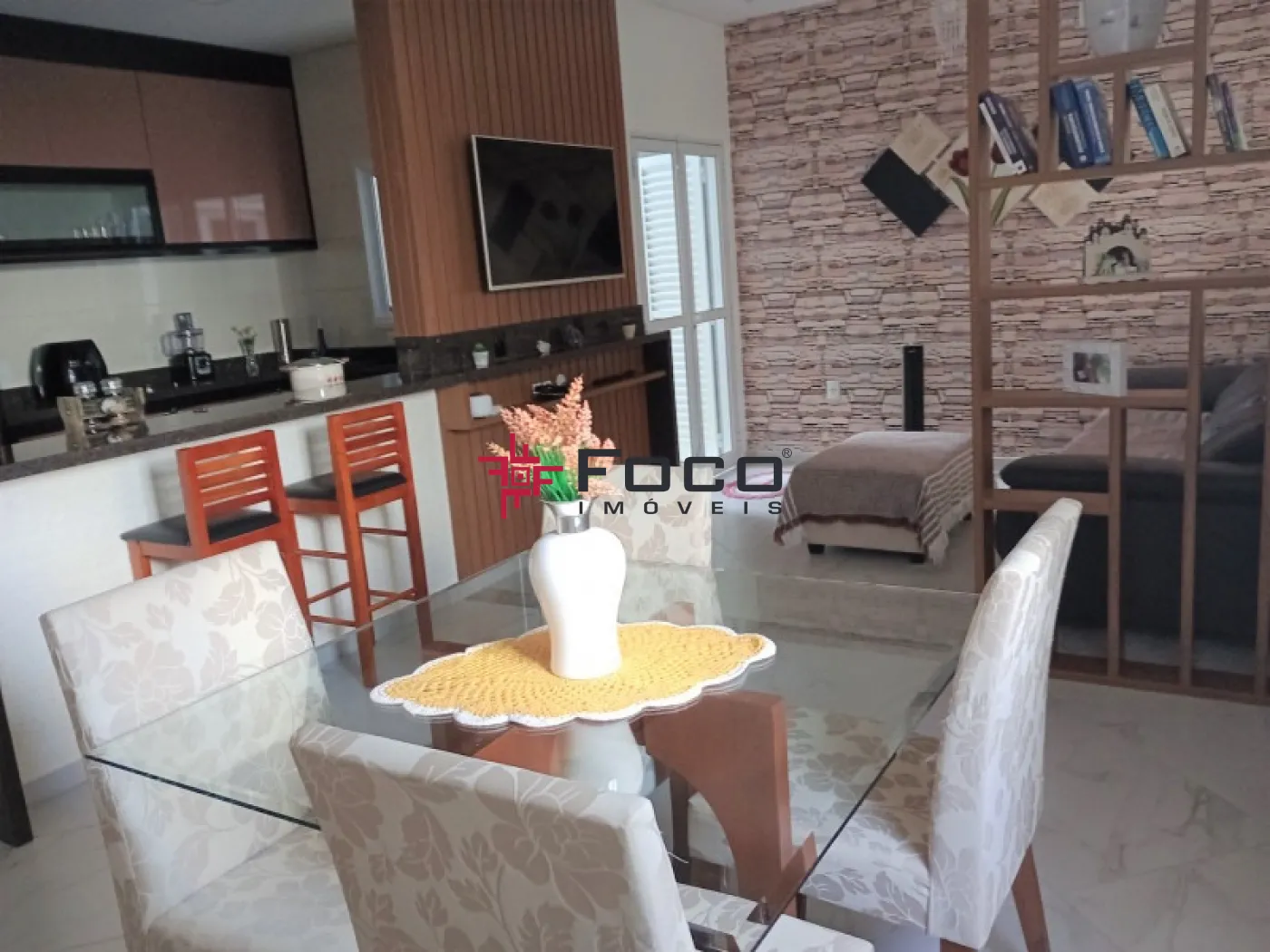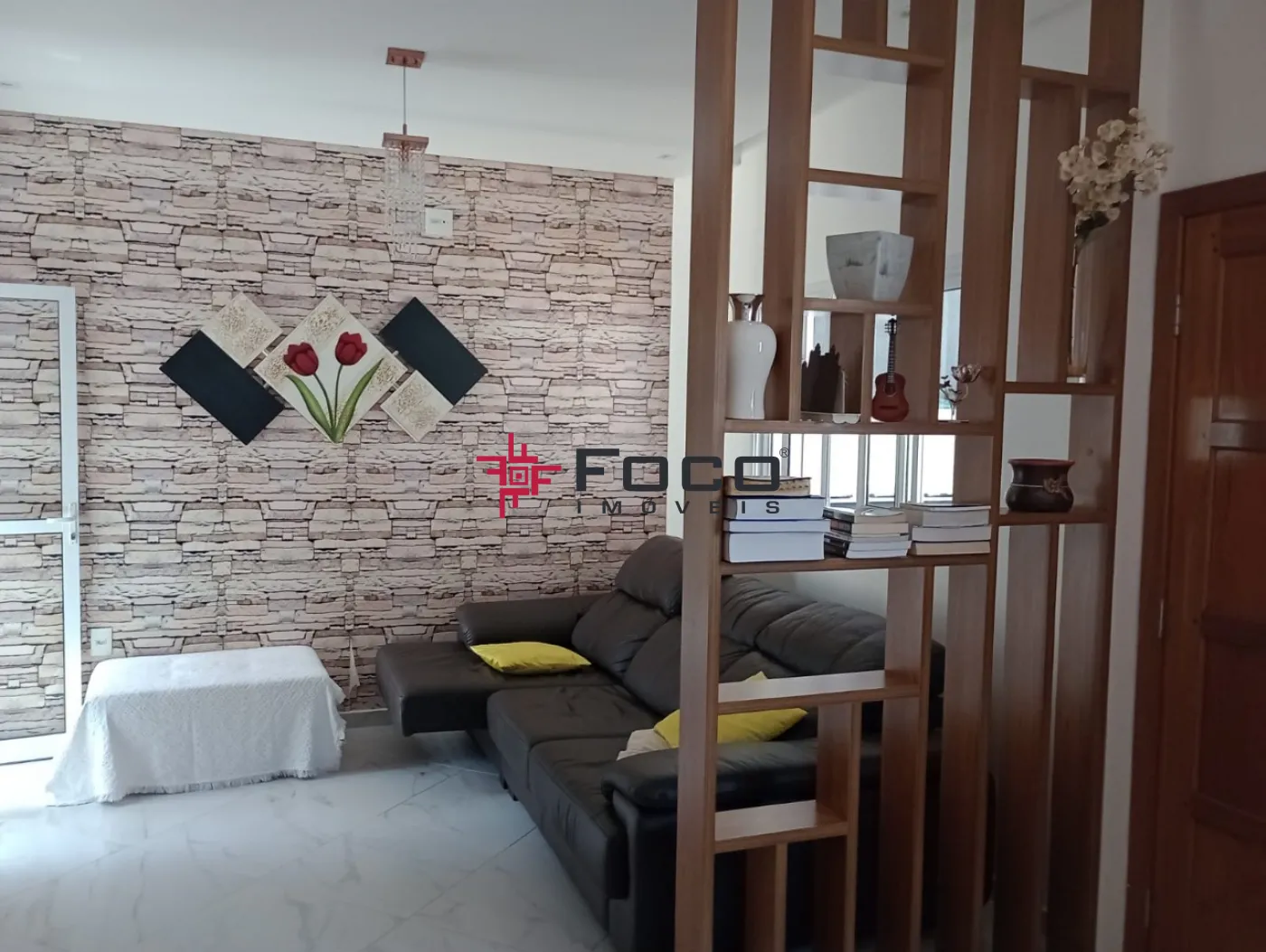 - 01 Sala Ampla e bem iluminada, perfeita para dois ambientes, com painel em madeira ripada e estante vazada personalizada