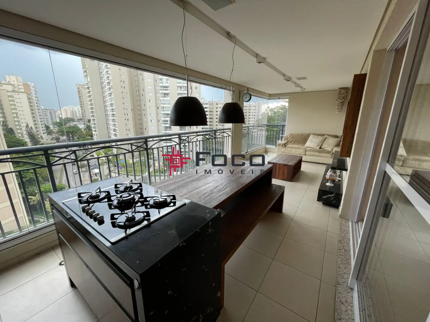 - Area Gourmet com bancada para cooktop, mesa para refeições e painel em madeira rustica para TV