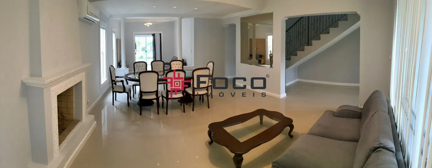 - Sala para 2 ambientes, com lareira e ar condicionado;