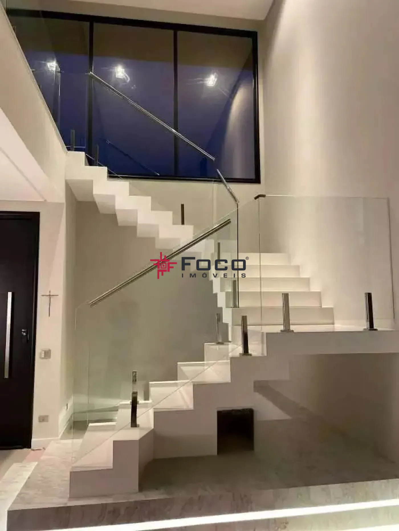 No pavimento térreo, sala com piso porcelanato e pé direito duplo, a entrada já convida a desfrutar do conforto e aconchego da área social, escada de mármore branco, proporcionando um ambiente `clean`. Possui uma suíte multiuso (dormitório/escritório ou home cinema), lavabo, sala de estar 2 ambientes, sala de jantar com mesa e sofá, cozinha planejada com ilha e acabamentos em quartzo branco, dispensa, lavanderia e área de serviço. Entrada lateral e hobby box..