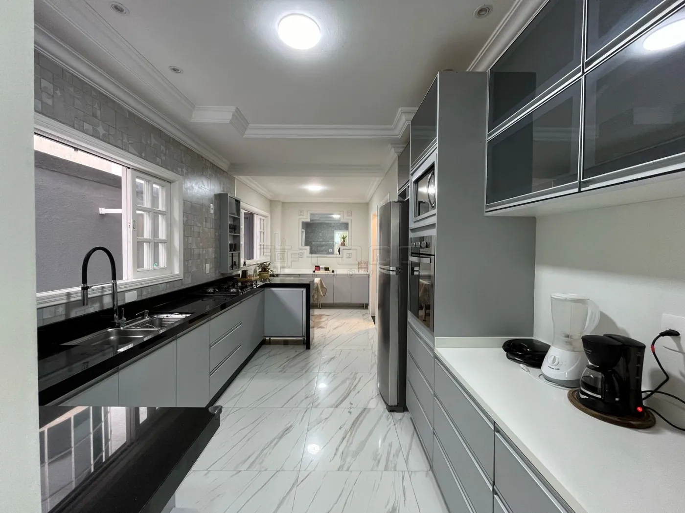 - 01 Cozinha ampla, arejada, com móveis planejados, cooktop, micro-ondas, forno e geladeira de inox