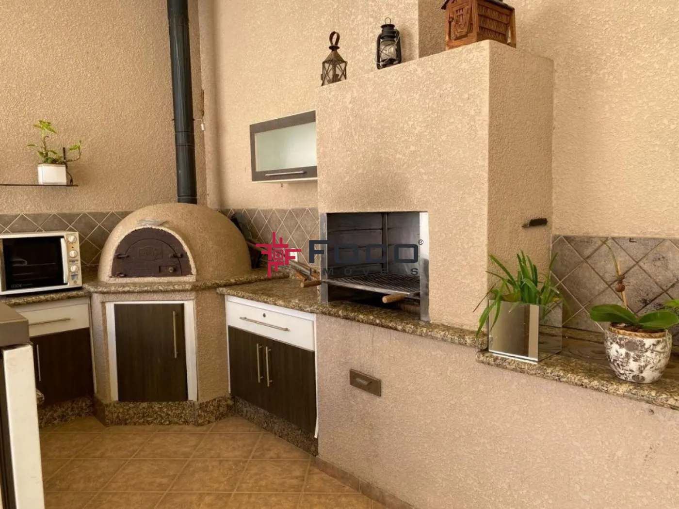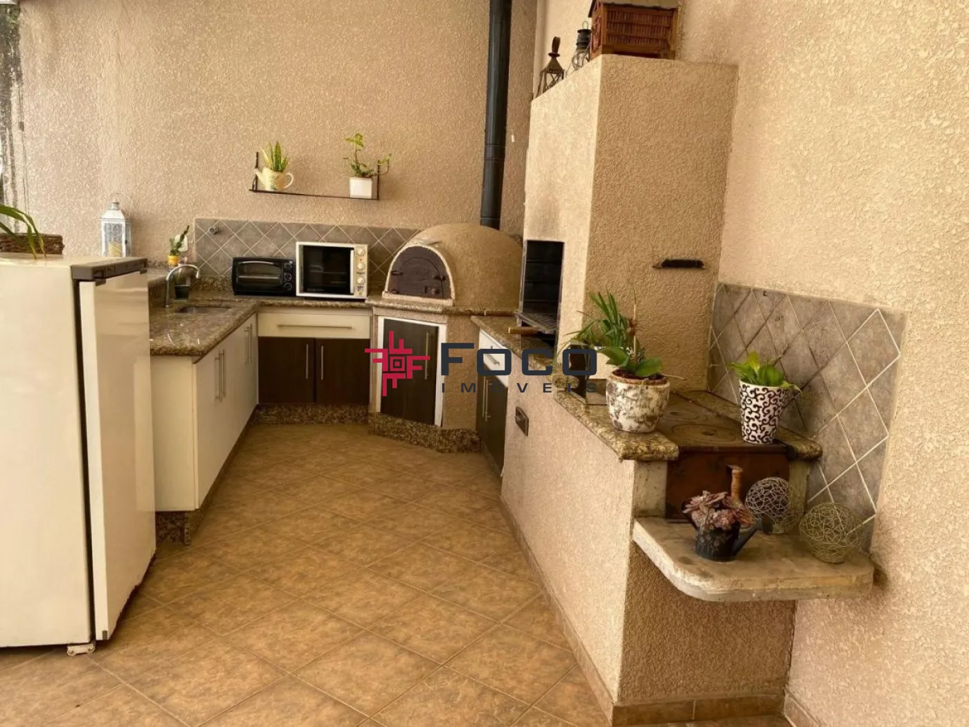 - Área gourmet com fogão à lenha, churrasqueira, forno de pizza e pia