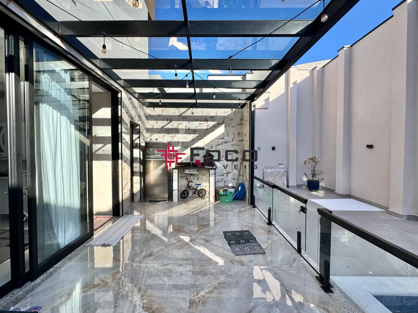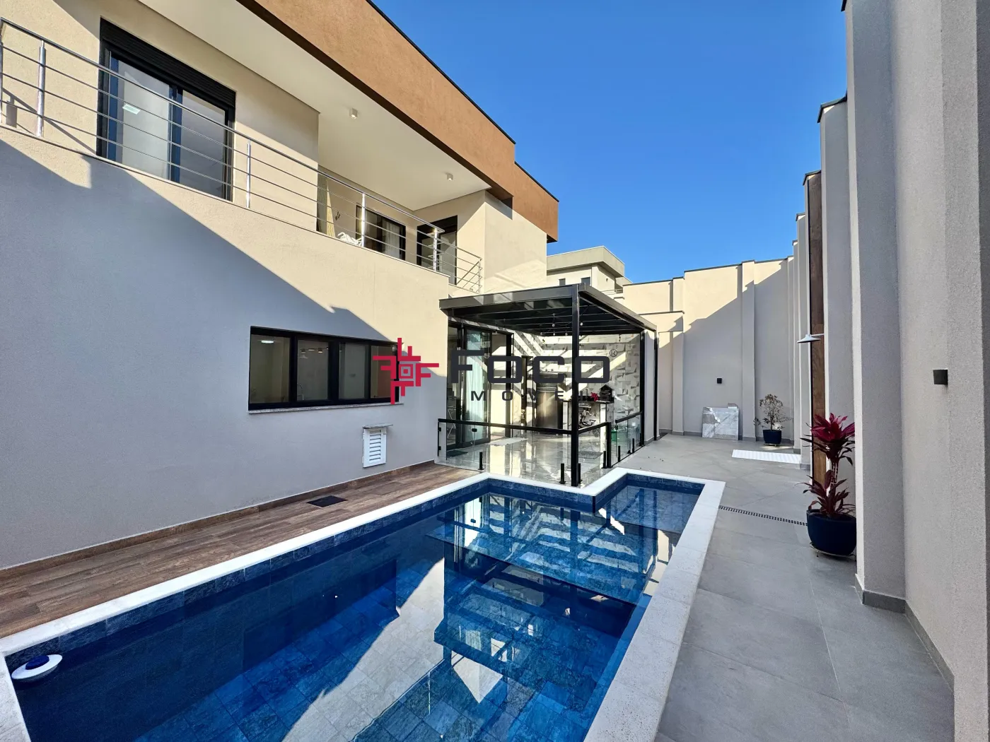 - Piscina com área gourmet coberta por vidro e banheiro externo