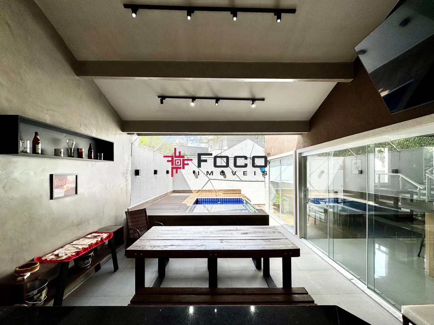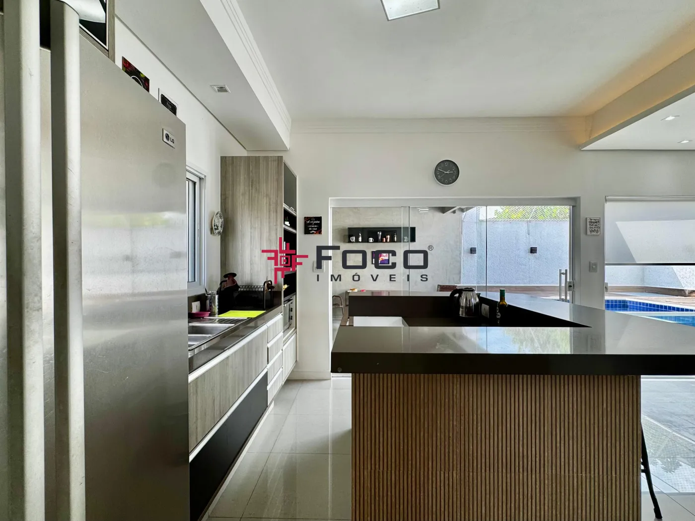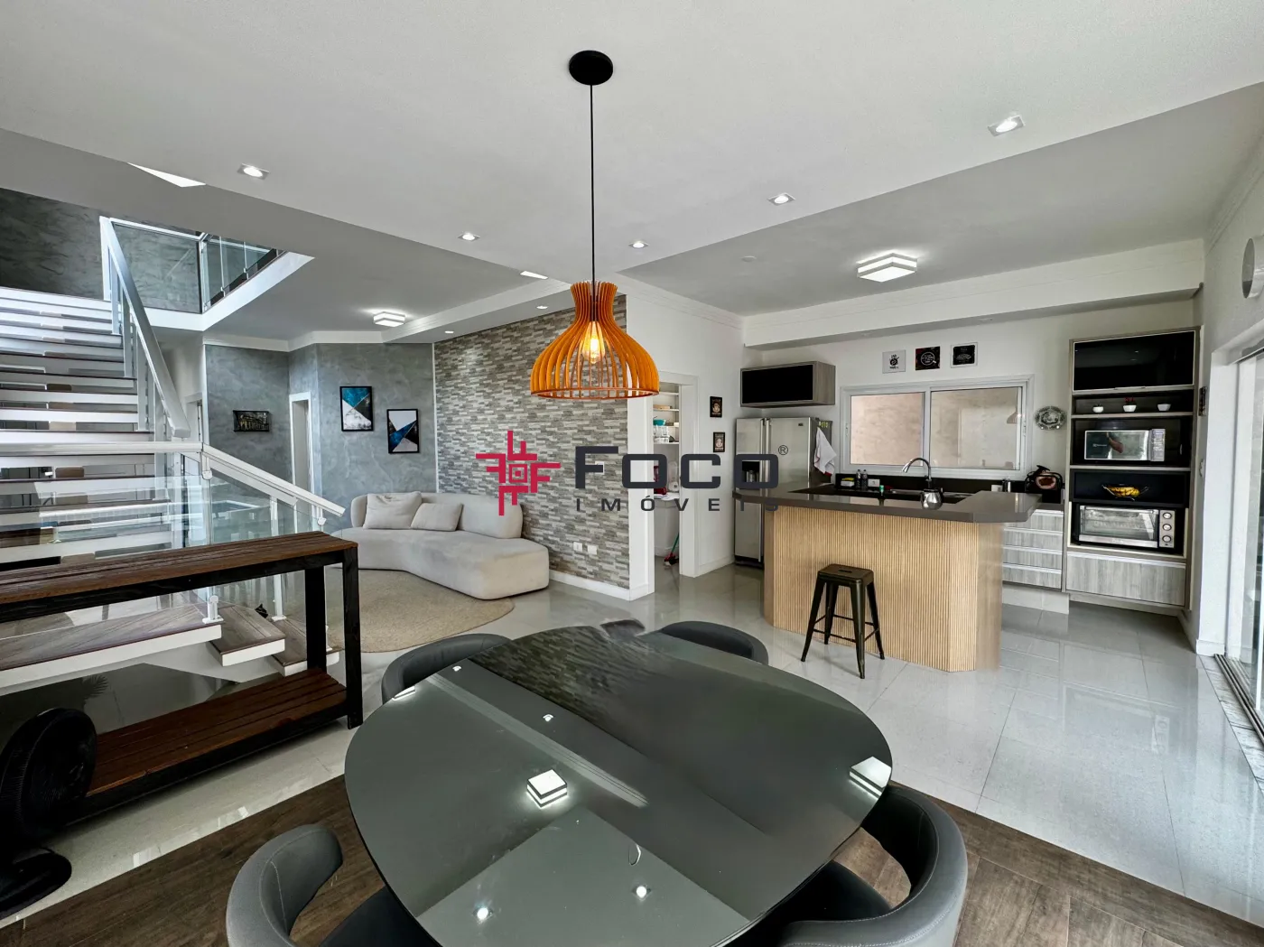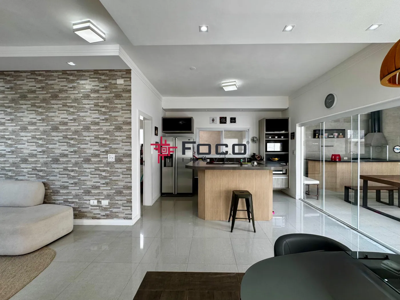 - Sala de estar, jantar e cozinha, com porta de correr para a área externa